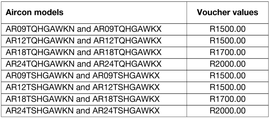 10. Air conditioning unit models included in this promotion are as follows and only applicable on sets, voucher amounts are as per list below